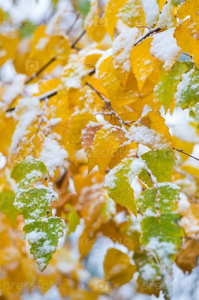 Листья березы в снегу