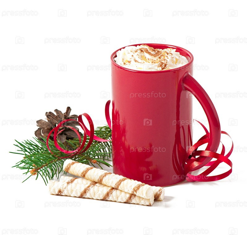 Рождественская открытка, красная кружка кофе со взбитыми сливками на белом фоне
