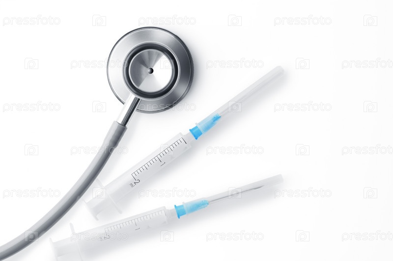 Стетоскоп и шприцы на белом фоне