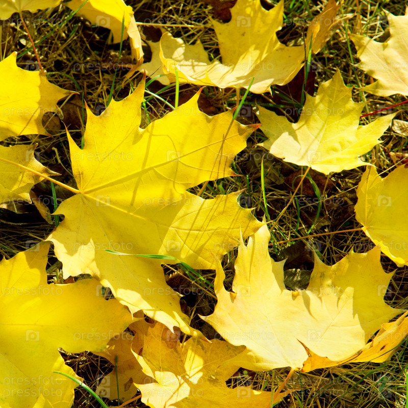 Желтые кленовые листья на зеленой траве