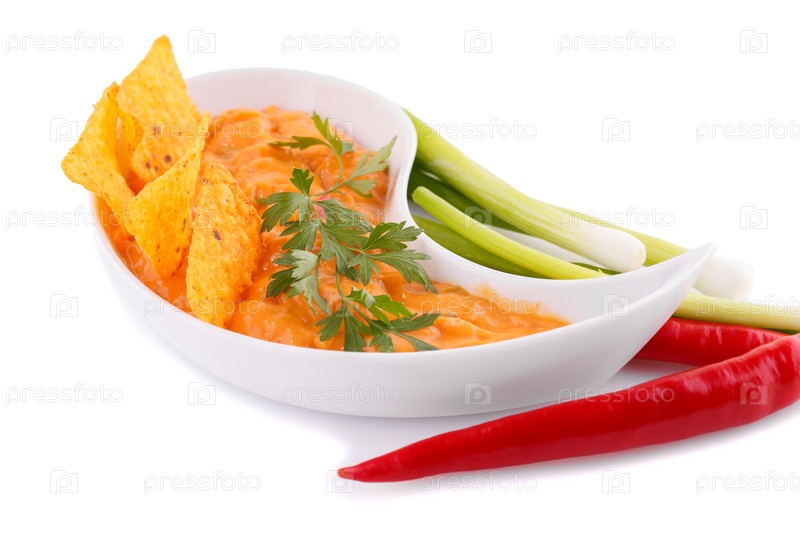 Начос, сырный соус, овощи