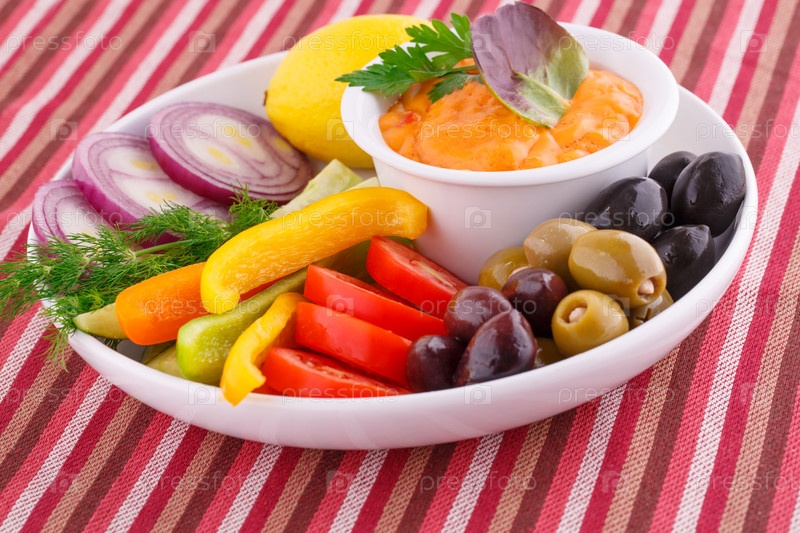 Овощи, оливки, лимон и сырный соус