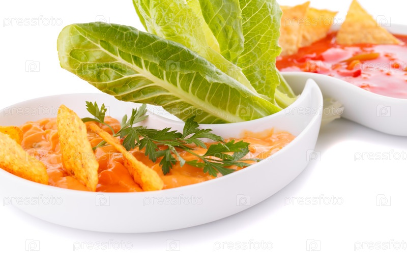 Начос, сырный и красный соус, овощи