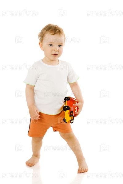 Мальчик с игрушечной машинкой на белом фоне