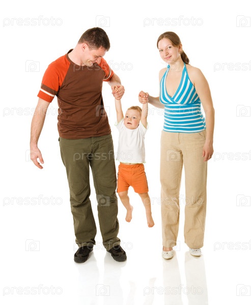 Счастливая семья с ребенком на белом фоне