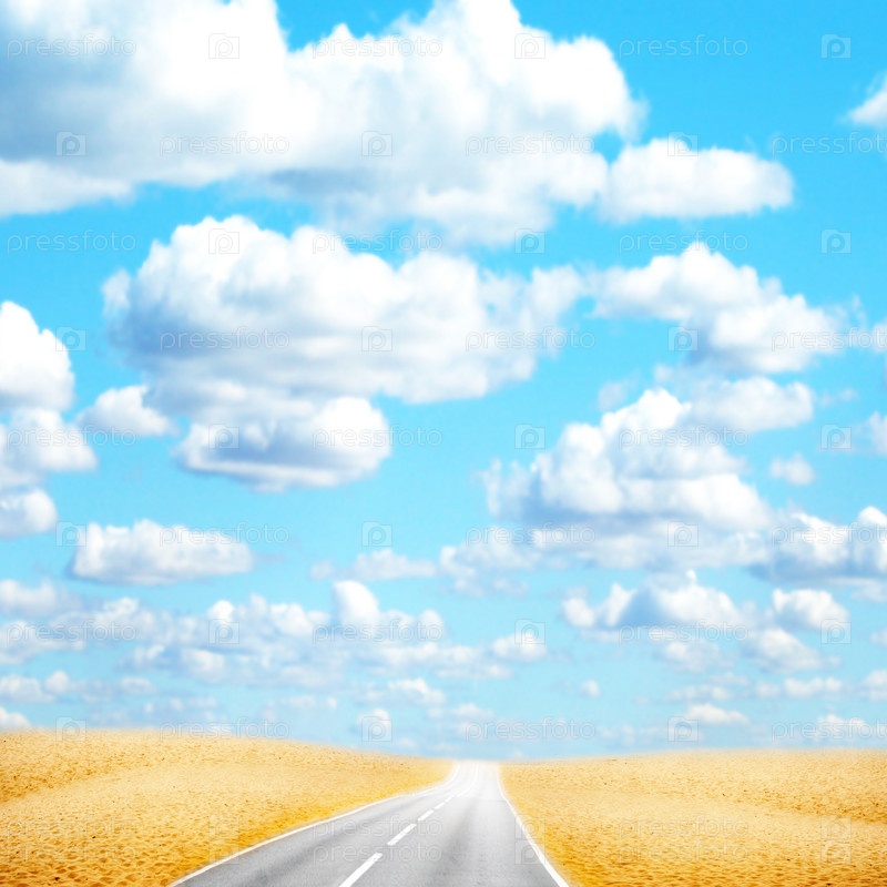 Голубое небо с облаками и дорога, уходящая вдаль