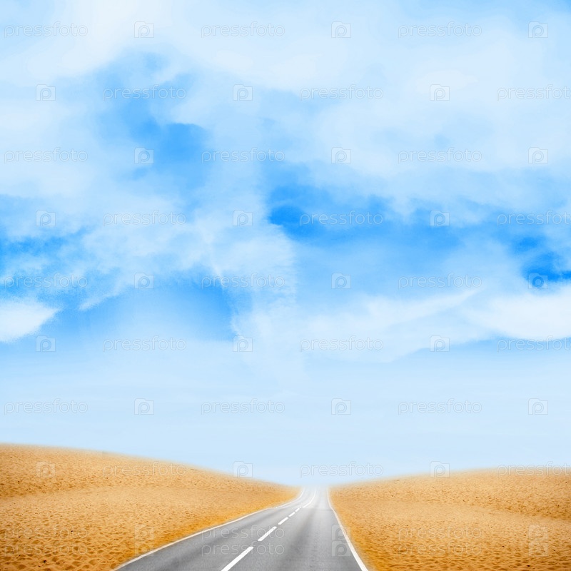 Голубое небо с облаками и дорога, уходящая вдаль
