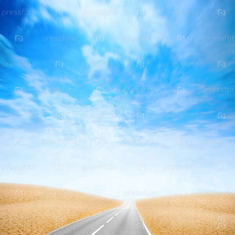 Голубое небо с облаками и дорога, уходящая вдаль