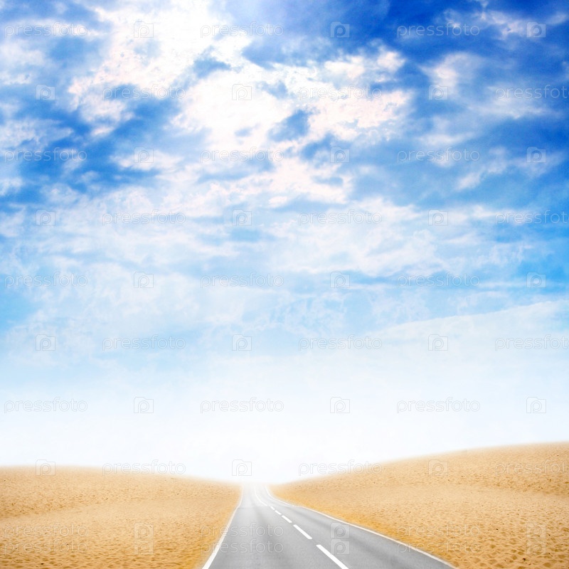 Синее небо с облаками и дорога, уходящая вдаль