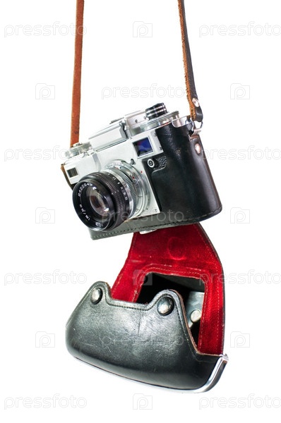 Ретрокамера в красно-черном корпусе подвесной ленты, изолированной на белом фоне