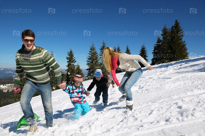 Семья отдыхает на свежем воздухе зимой