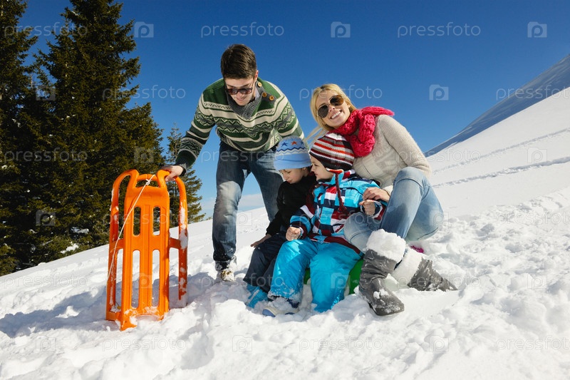 Семья отдыхает на свежем воздухе зимой