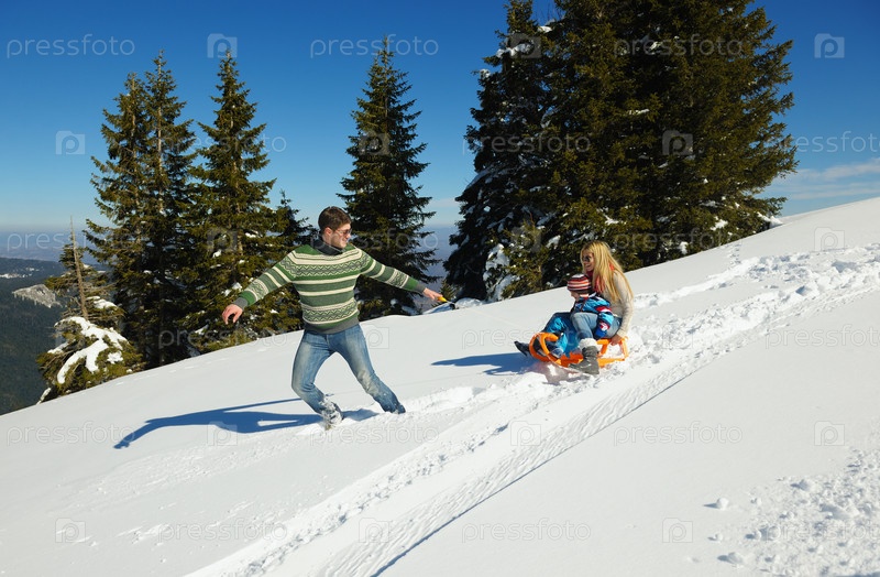 Семья отдыхает на свежем воздухе зимой