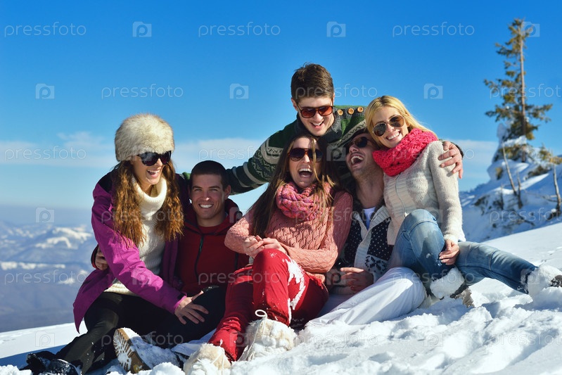 Группа молодых людей отдыхает на свежем воздухе зимой