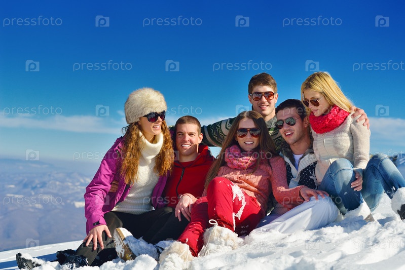 Группа молодых людей отдыхает на свежем воздухе зимой