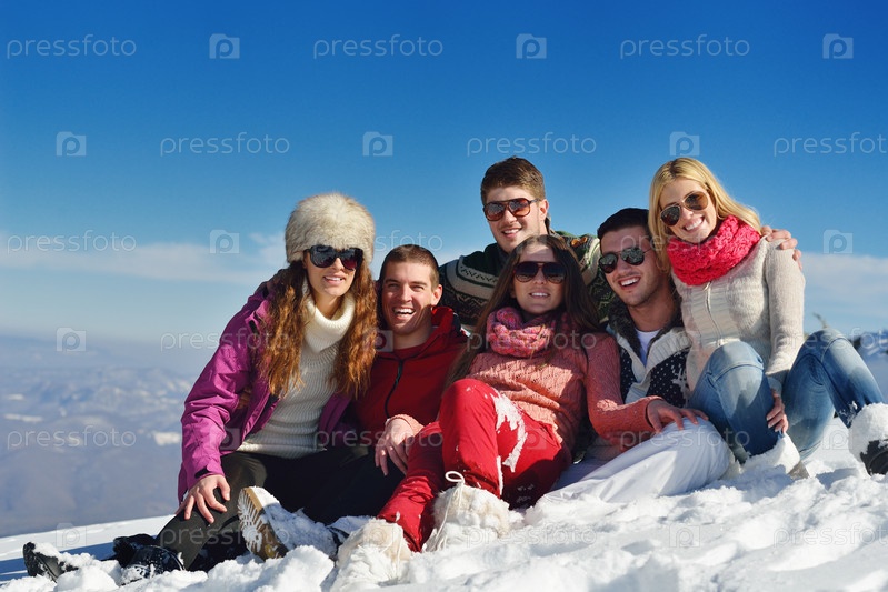 Группа молодых людей отдыхает на свежем воздухе зимой
