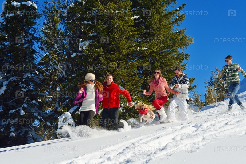 Группа молодых людей отдыхает на свежем воздухе зимой
