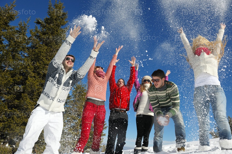 Группа молодых людей отдыхает на свежем воздухе зимой