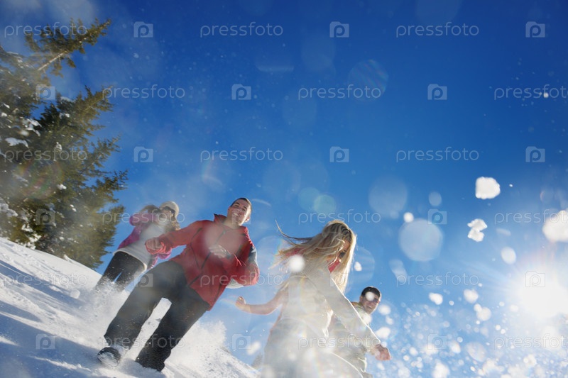 Группа молодых людей отдыхает на свежем воздухе зимой