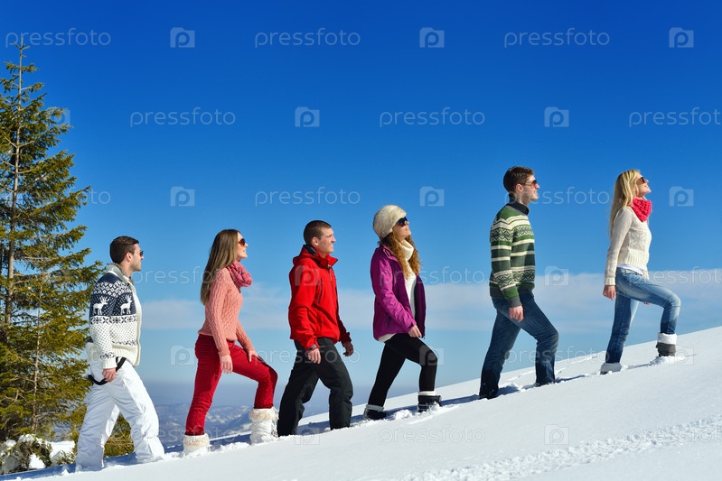 Группа молодых людей отдыхает на свежем воздухе зимой
