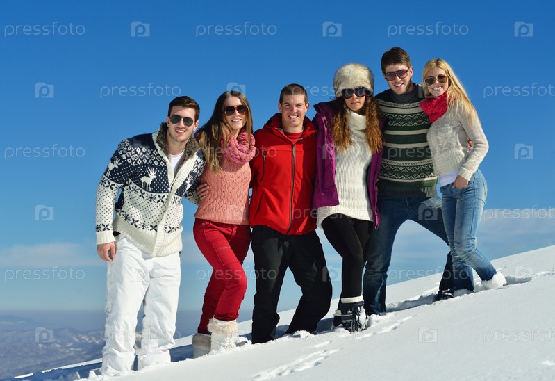 Группа молодых людей отдыхает на свежем воздухе зимой