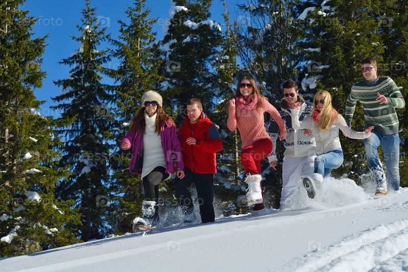Группа молодых людей отдыхает на свежем воздухе зимой