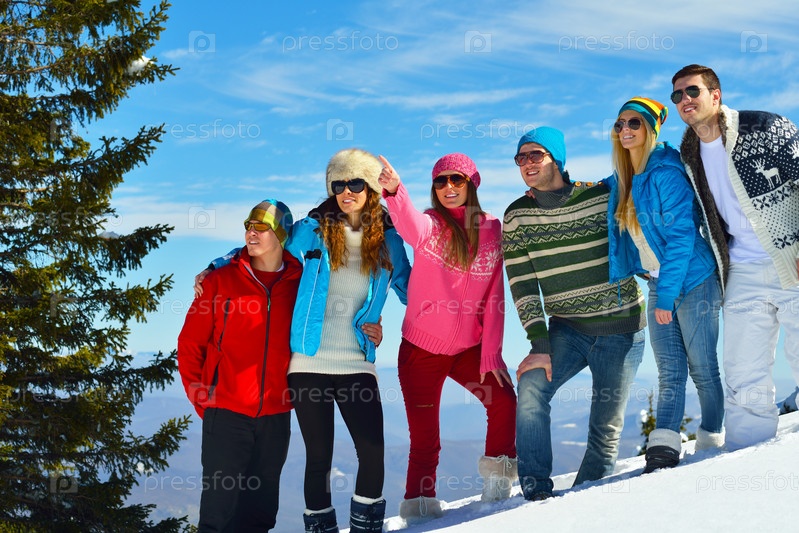 Группа молодых людей отдыхает на свежем воздухе зимой