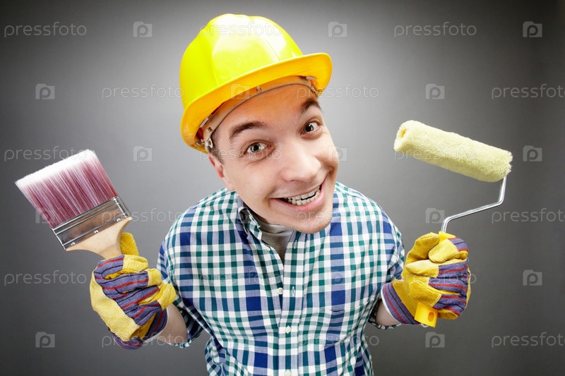 Веселый строитель на сером фоне