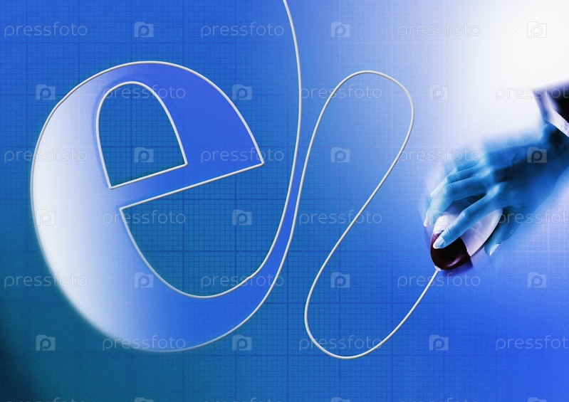 Знак Интернета и компьютерная мышка в руке, синий фон
