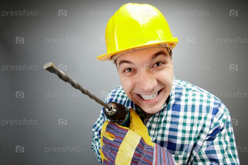 Строитель с сумасшедшим лицом и с дрелью в руках