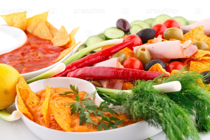 Начос, оливки, свиная корейка, соус и овощи