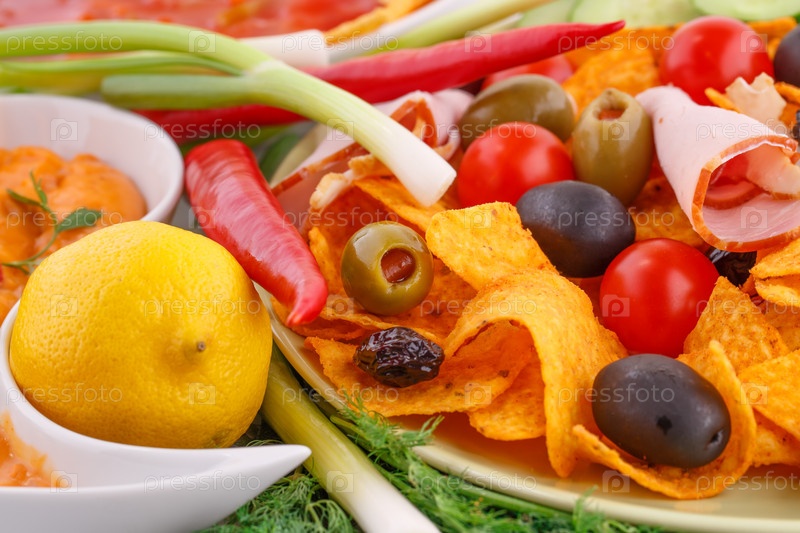 Начос, оливки, свинина и овощи