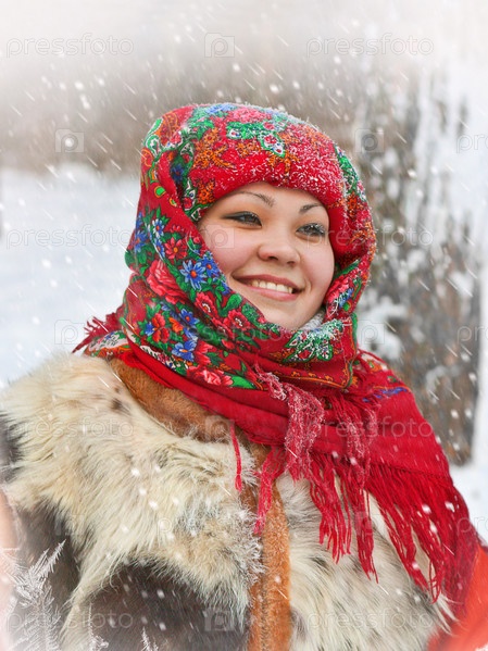 Зимний портрет жизнерадостной девушки в цветном платке на морозе