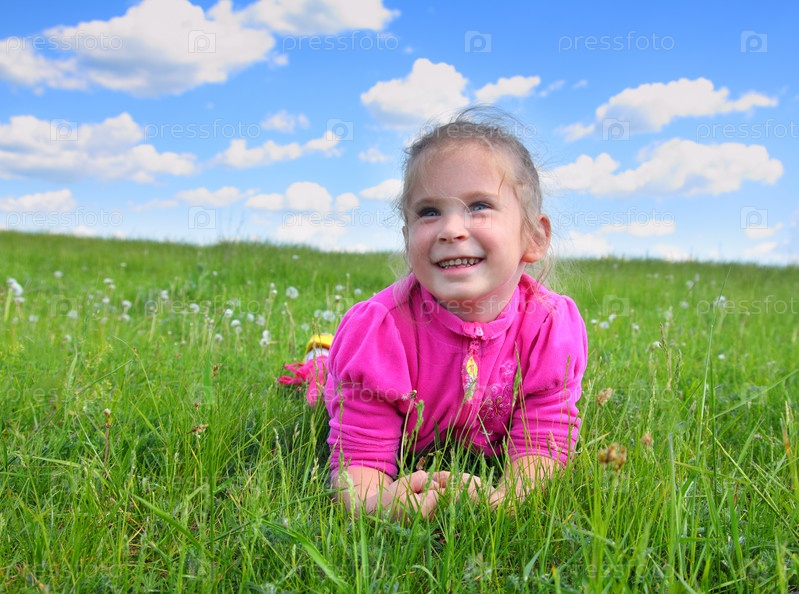 Счастливая девочка лежит на траве
