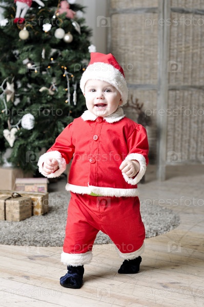 Ребенок в костюме Санта возле елки