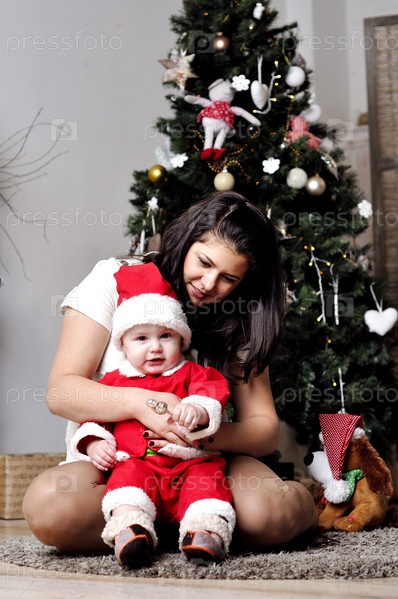 Ребенок в костюме Санты с матерью возле елки
