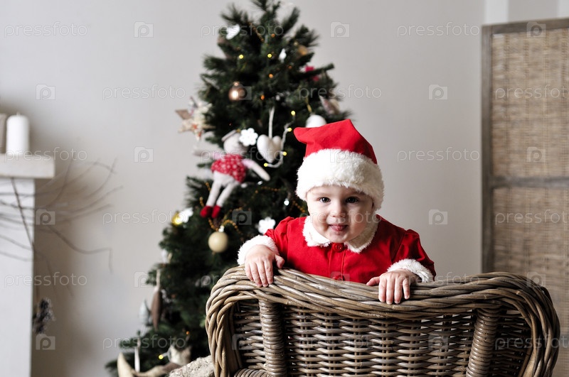 Ребенок в костюме Санты сидит на стуле возле елки