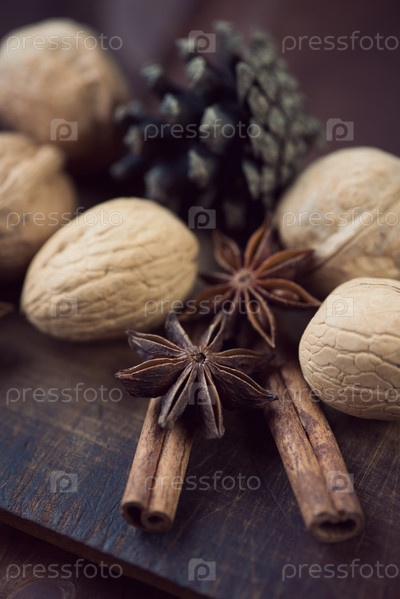 Семена аниса, корица и грецкие орехи на разделочной доске