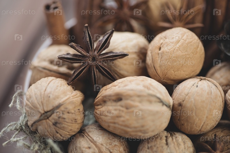 Грецкие орехи, корица и анис крупным планом
