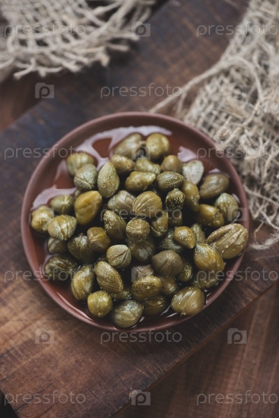 Маринованные каперсы в керамическом блюдце, вид сверху