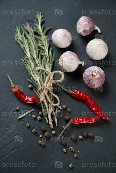 Пучок розмарина, чеснок и различный перец