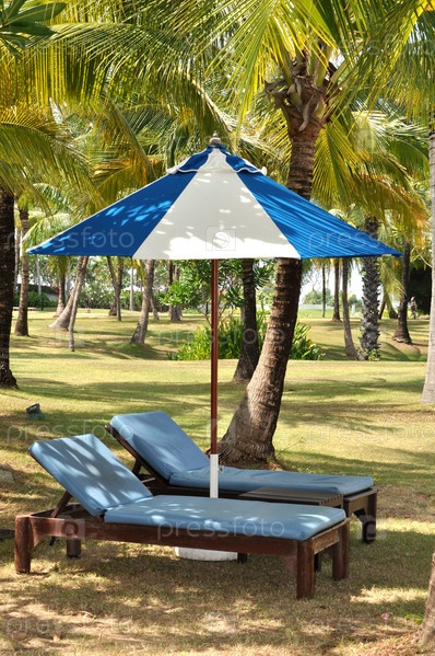 Пустые шезлонги в пальмовой роще, остров Пхукет, Тайланд