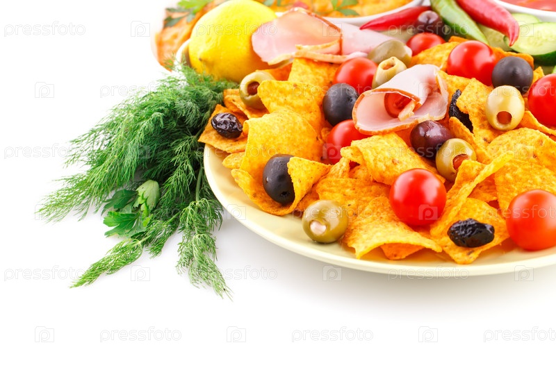 Начос, оливки, свинина и овощи
