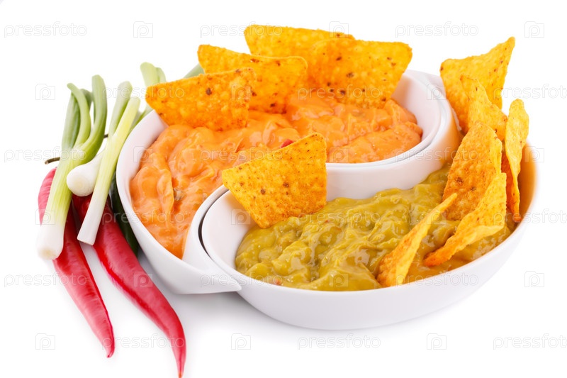 Начос, гуакамоле и соус из сыра, овощи