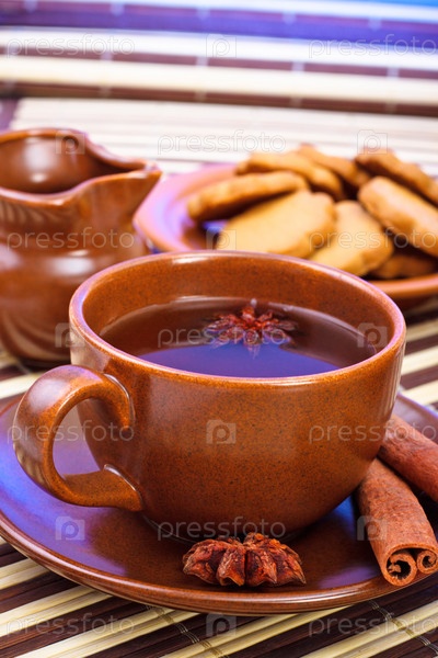 Чай с корицей и печенье на бамбуковой салфетке