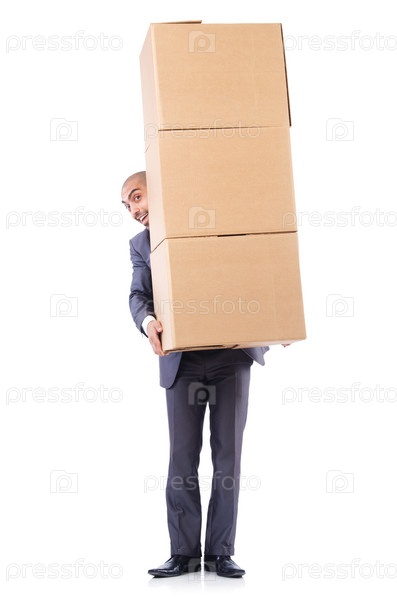 Бизнесмен с коробкой, изолированный на белом