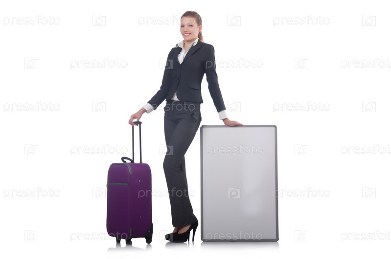 Женщина с чемоданом на белом фоне