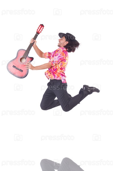 Человек с гитарой, изолированный на белом