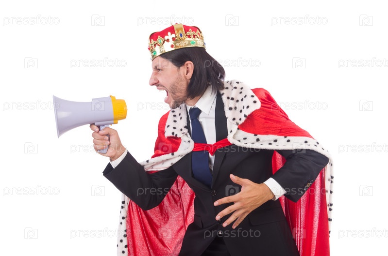 Король бизнесмен с громкоговорителем, изолированный на белом