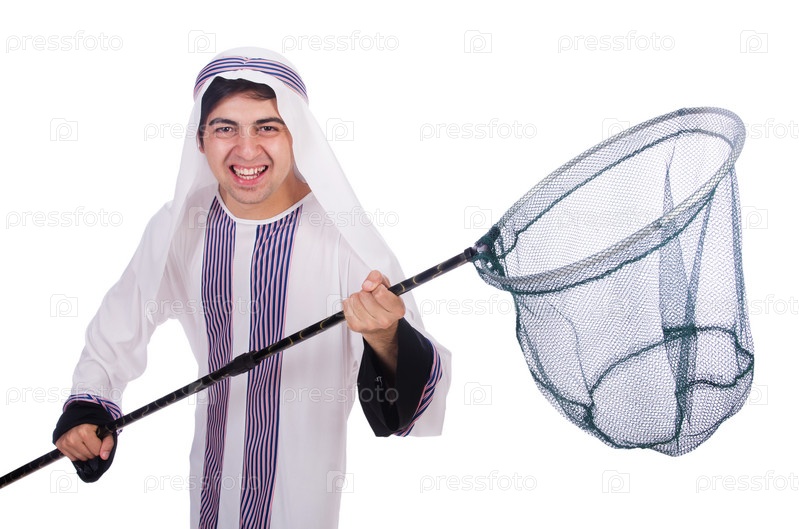 Арабский бизнесмен с сачком на белом фоне